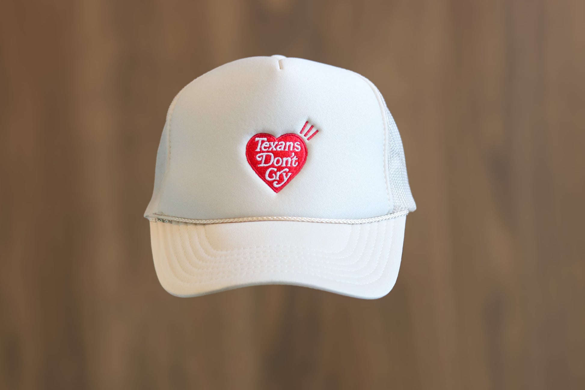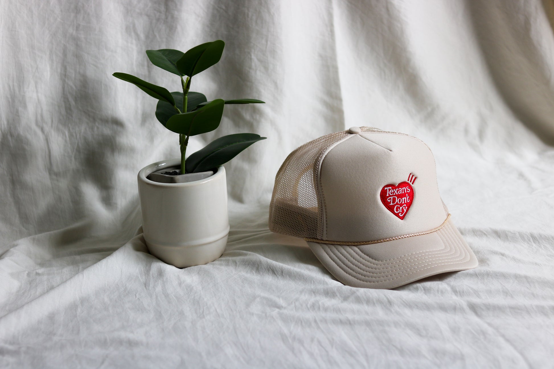 Texans Don’t Cry Heart Patch Trucker Hat – Unisex, One Size Fits All - Beige